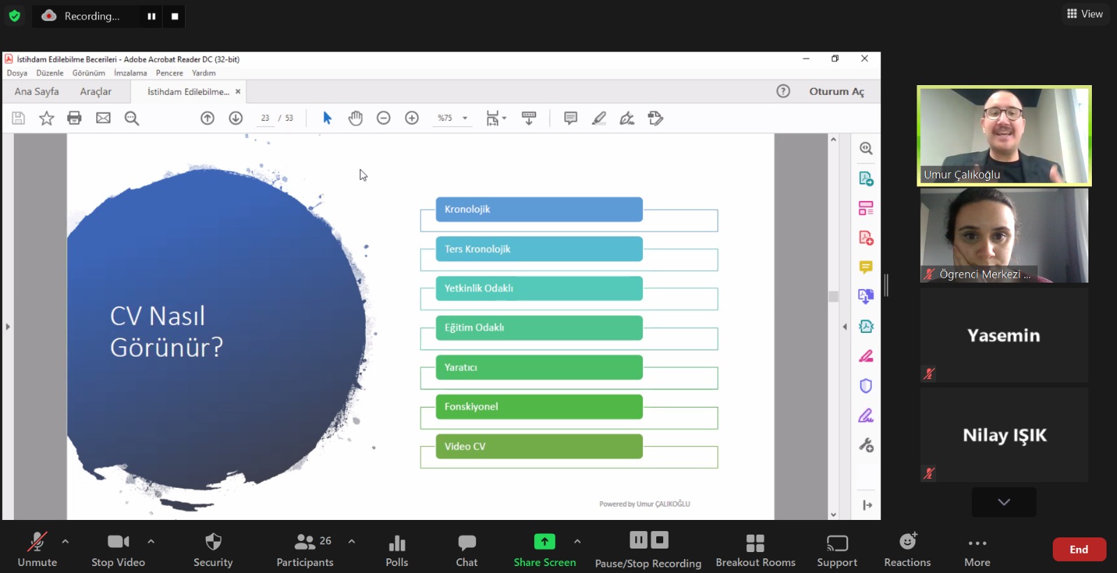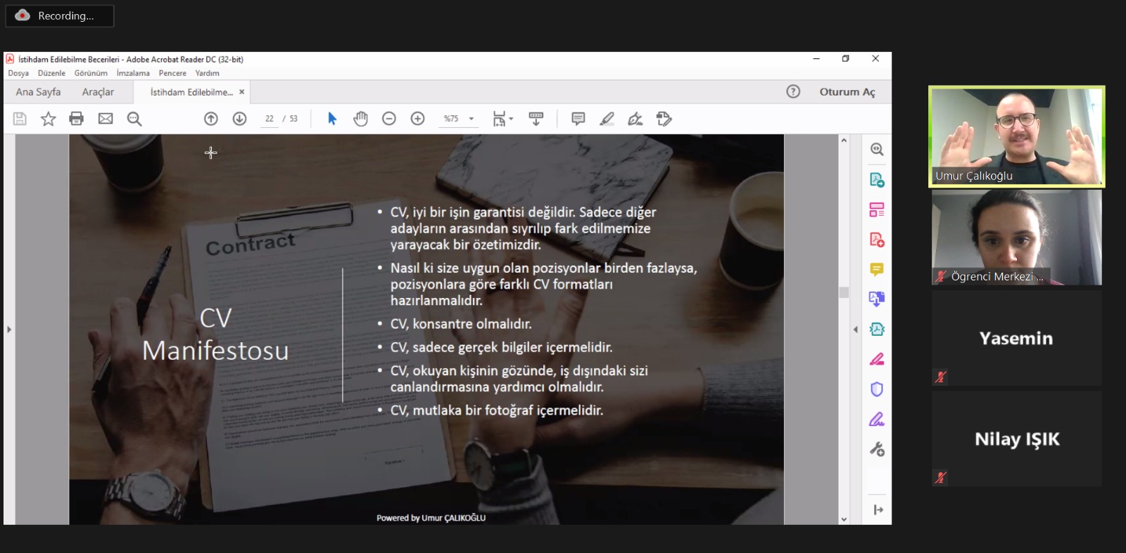 ÖMER Kariyer Ofisi Sorumlumuz Umur ÇALIKOĞLU tarafından hazırlanan CV Hazırlama Semineri 25 Şubat Çarşamba günü online olarak düzenlendi. Değişik bölümlerden öğrencilerimizin katılım gösterdiği seminerin sonunda soru-cevap bölümü de yapıldı.
