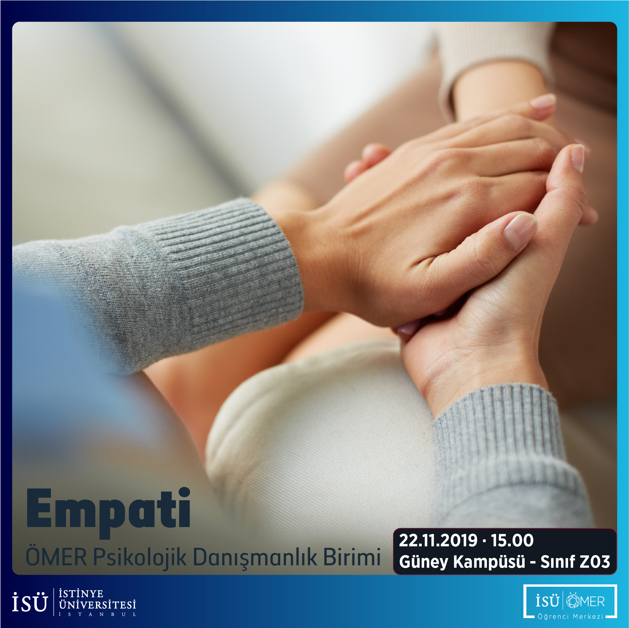 22 Kasım 2019 günü 15.00 – 16.00 saatleri arasında Güney Kampüs Z03 dersliğinde ''Empati'' atölyesi gerçekleştirilmiştir. Atölye de katılımcılara hangi durumlarda empati, hangi durumlarda sempati geliştirdiğimizi ve hayatımızdaki önemi üzerine uygulamalı çalışma yapılmıştır.