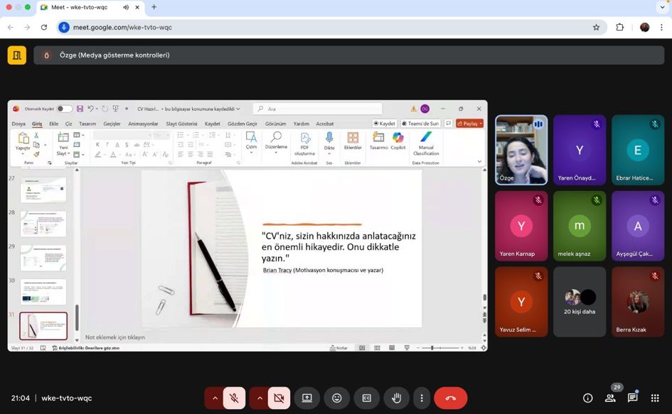 Katılımcılara CV’de bulunması gereken bölümler, doğru ifade teknikleri, tasarım ipuçları ve işverenlerin dikkat ettiği kriterler hakkında kapsamlı bilgiler verildi. Ayrıca sektörel beklentilere uygun bir CV hazırlamak için yapılması gerekenler örnekler üzerinden anlatıldı.
