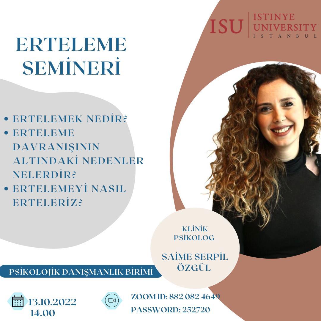 Ertelemek nedir ?Erteleme davranışının altındaki nedenler nelerdir ?Ertelemeyi nasıl erteleriz ? Sorularının yanıtlarını bulmak ve nasıl çözüm yolunda ilerleyebileceğimizi anlayabilmek için gerçekleştirdiğimiz seminerimiz.