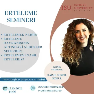 Ertelemek nedir ?Erteleme davranışının altındaki nedenler nelerdir ?Ertelemeyi nasıl erteleriz ?Sorularının yanıtlarını bulmak ve nasıl çözüm yolunda ilerleyebileceğimizi anlayabilmek için gerçekleştirdiğimiz seminerimiz.