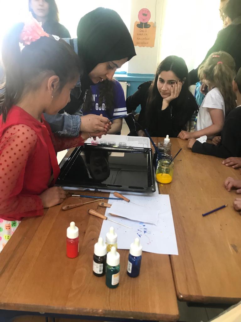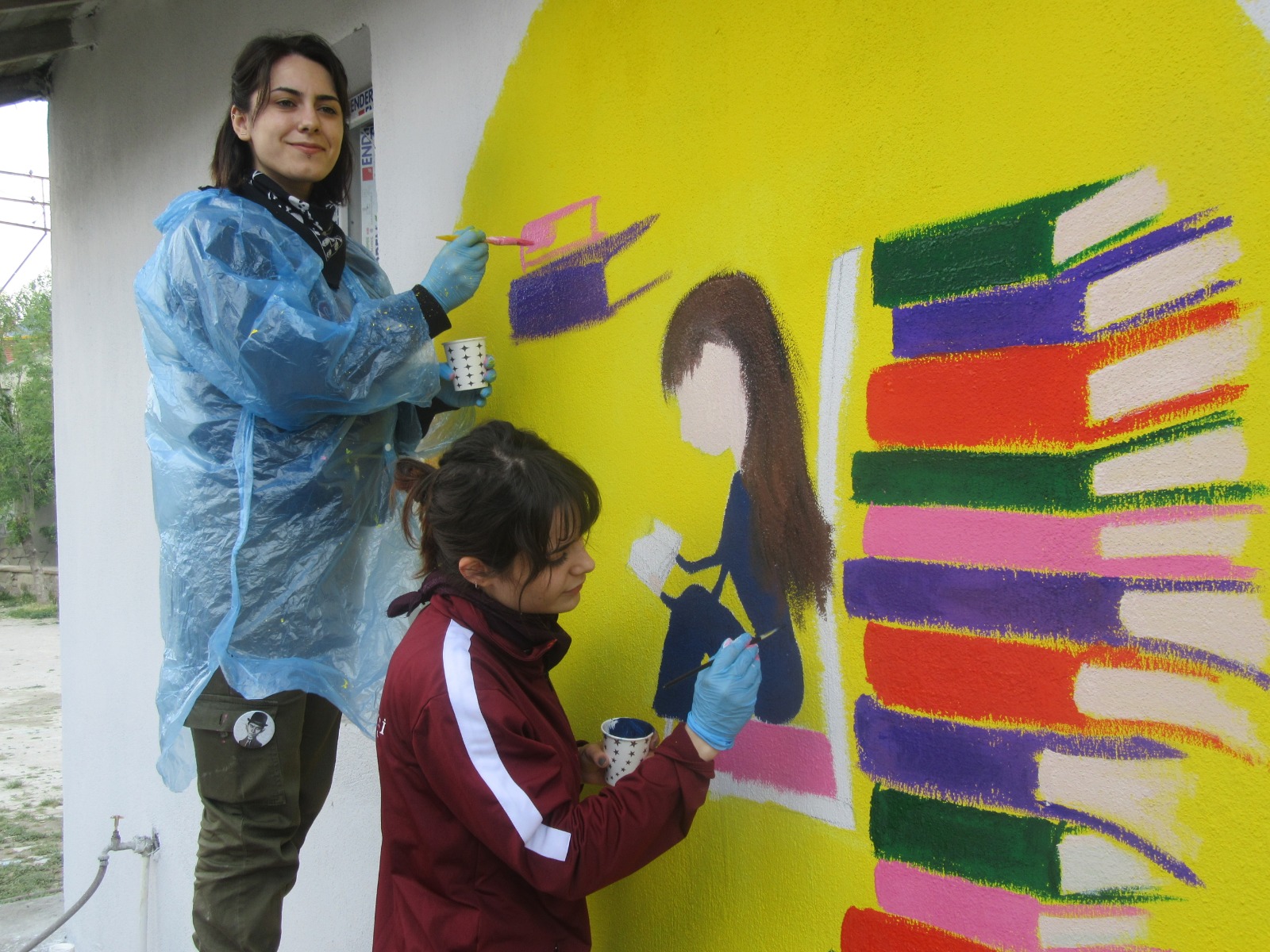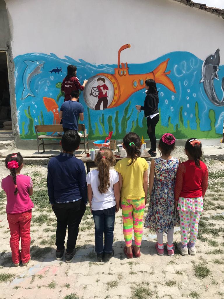Binanın yanındaki atıl vaziyetteki lojman içerisine kütüphane ve oyun alanı oluşturan üniversite öğrencilerimiz, okul duvarlarına da boyalarla kitap ve çeşitli görsel içeren resimler yaptılar.