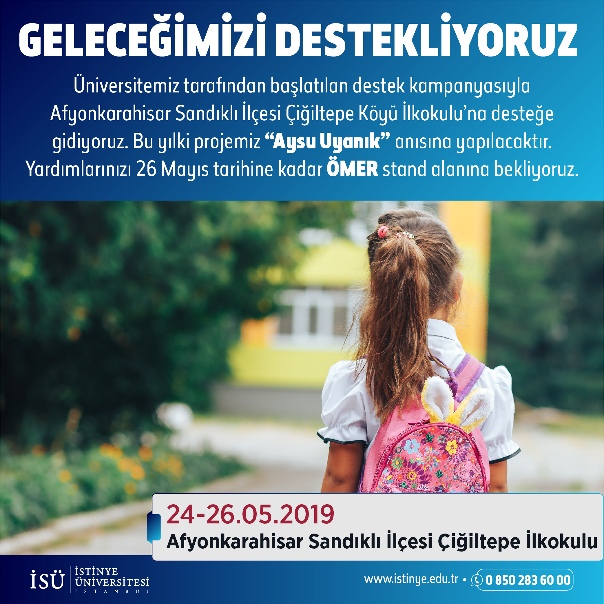İstinye Üniversitesi Öğrenci Merkezi (ÖMER) tarafından bu yıl ikincisi düzenlenen köy okulu projesi kapsamında Sosyal Hizmetler bölümü öğrencisi Aysu Uyanık adına Afyonkarahisar'ın Sandıklı İlçesi Çiğiltepe Köyü İlkokuluna yardım etkinliği başlatıldı.