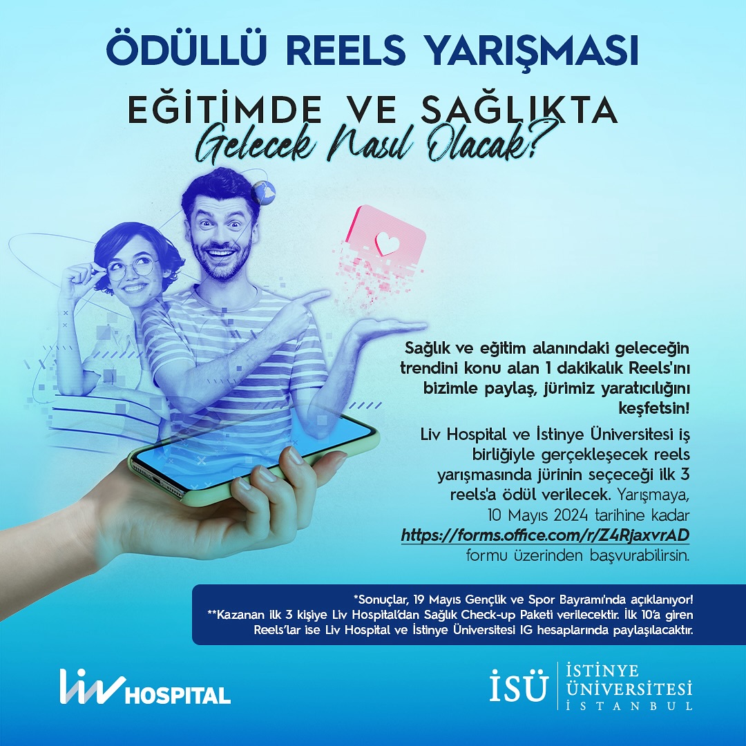 Liv Hospital ve İstinye Üniversitesi işbirliği ile gerçekleştireceğimiz "Eğitimde ve Sağlıkta Gelecek Nasıl Olacak?" konulu Reels yarışmamıza değerli öğrencilerimizin katılımını bekliyoruz.