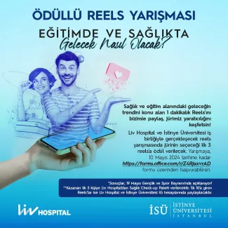 İstinye Üniversitesi ve Liv Hospital iş birliğiyle gerçekleşecek reels yarışmasında jürinin seçeceği ilk 3 reels'a ödül verilecek. Yarışmaya 10 Mayıs 2024 tarihine kadar yarışma formu üzerinden başvurabilirsin.