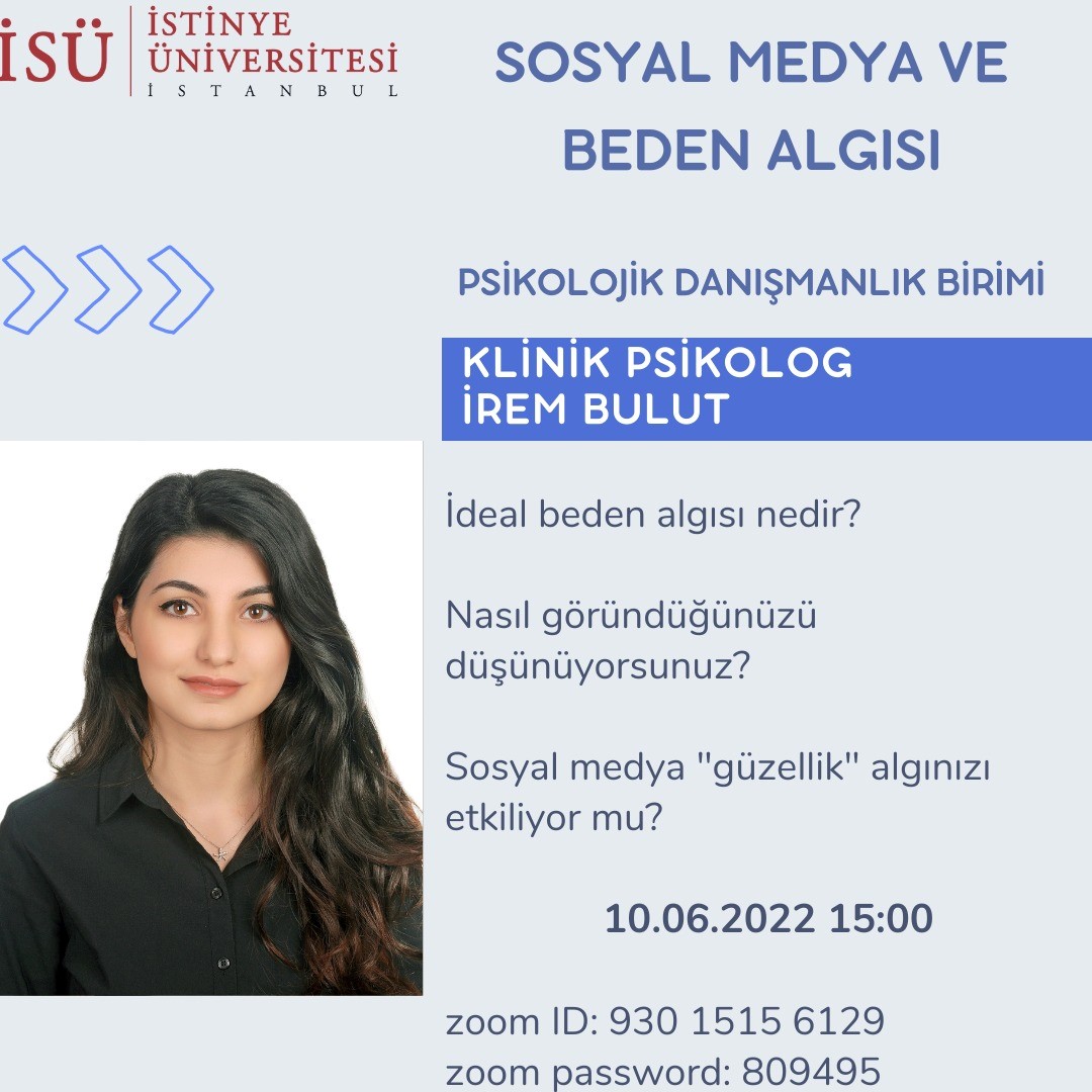Klinik Psikolog İrem Bulut’un sunumuyla beden algısı, kendiyle ilişki kurabilme, sosyal medyadaki algılar, güzellik ve ideal güzellik üzerine gerçekleştireceğimiz seminerimize herkesi bekleriz.