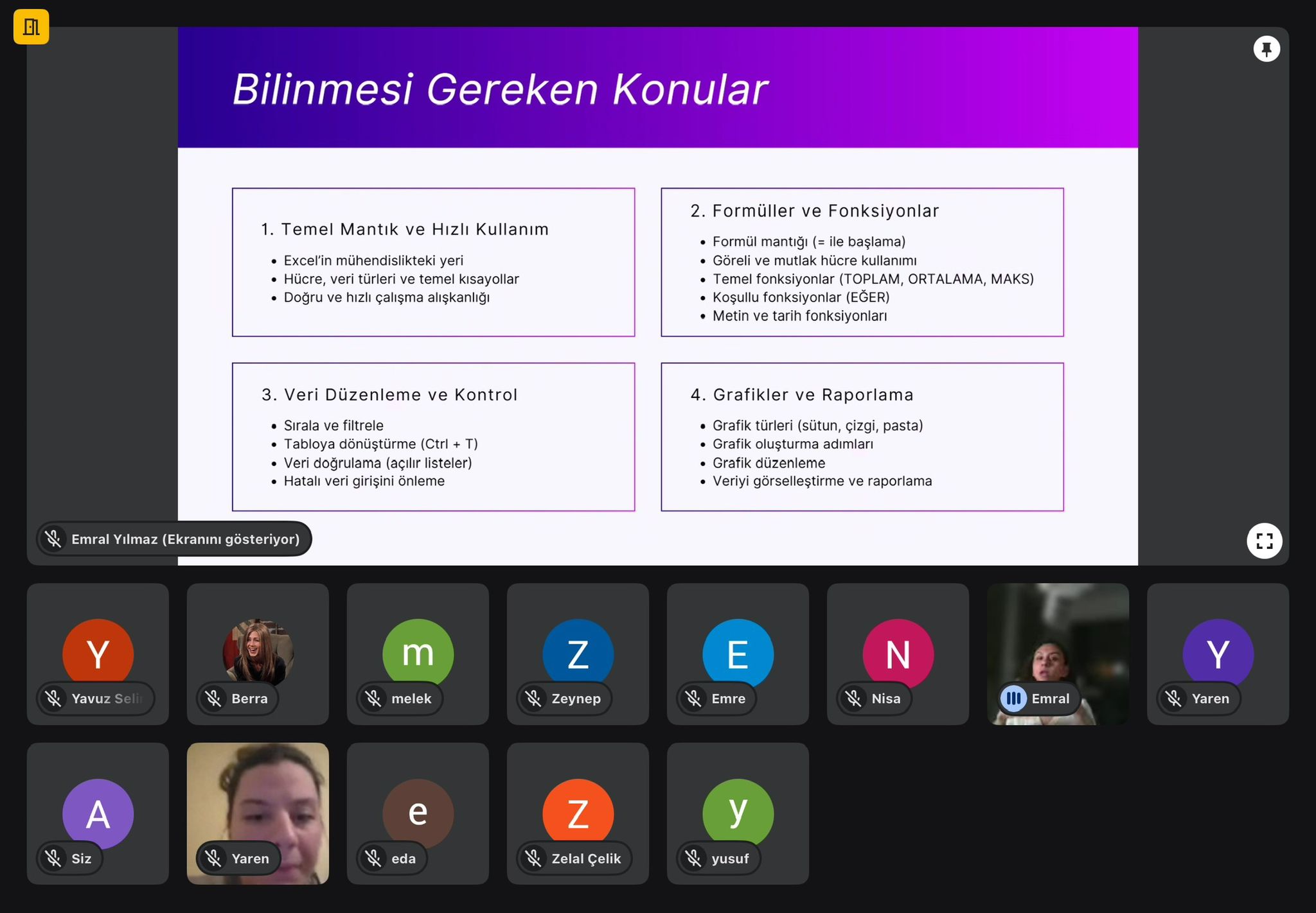 Online ortamda gerçekleştirilen Excel Eğitimi, öğrencilerin dijital yetkinliklerini artırmayı, veriyle çalışma becerilerini güçlendirmeyi ve özellikle staj, proje ve iş hayatına hazırlık sürecinde ihtiyaç duyacakları temel araçlardan biri olan Excel’i daha etkin kullanmalarını hedefledi.