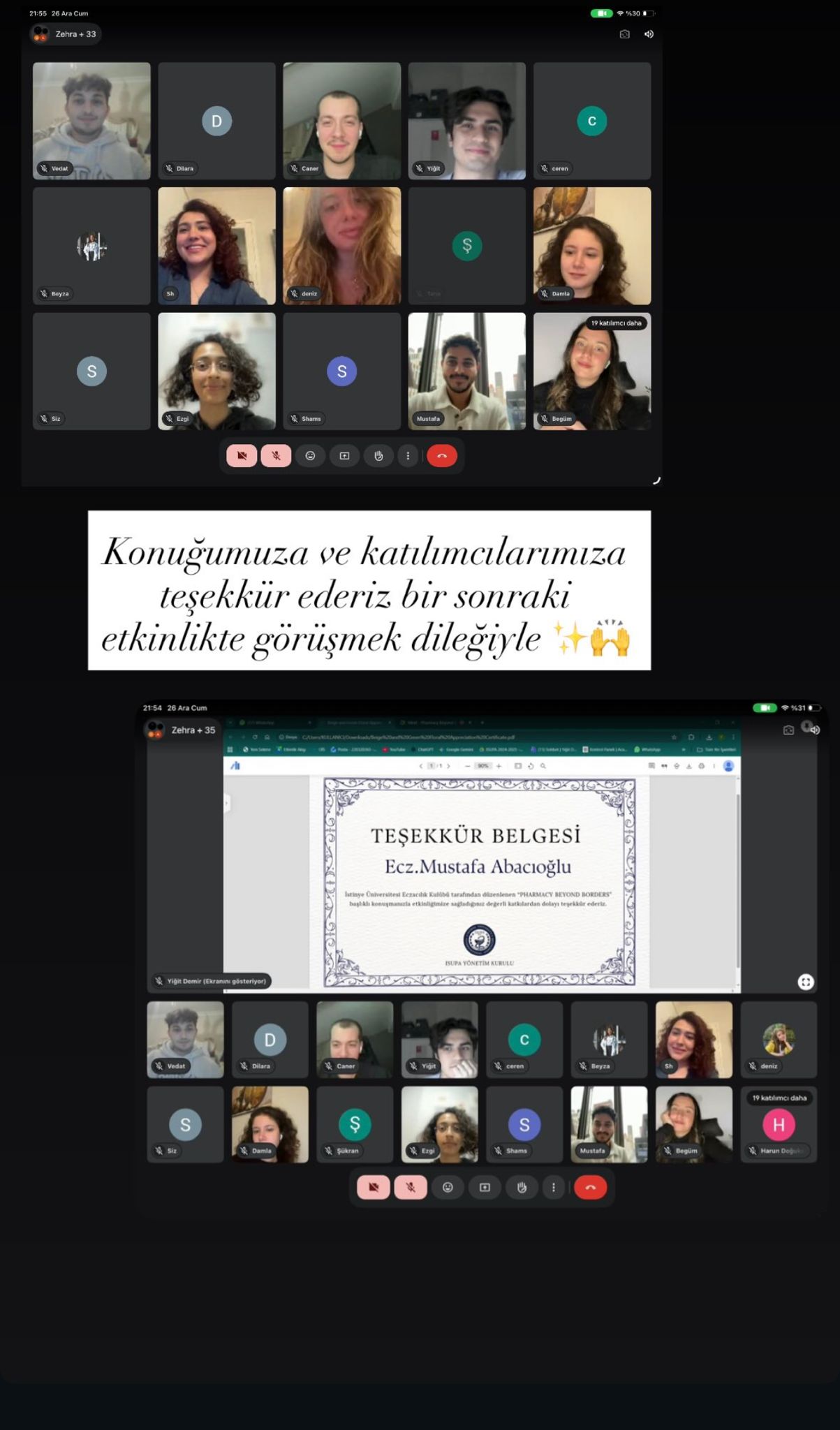 Katılımcılar, farklı ülkelerdeki eczacılık uygulamalarını ve kariyer fırsatlarını öğrenerek kendi mesleki gelişimlerine yönelik yeni bakış açıları kazanmıştır. Etkinlik, öğrencilerin uluslararası alanda kendilerini geliştirmelerine destek olan, bilgilendirici ve vizyon kazandırıcı bir çevrim içi buluşma olarak tamamlanmıştır.
