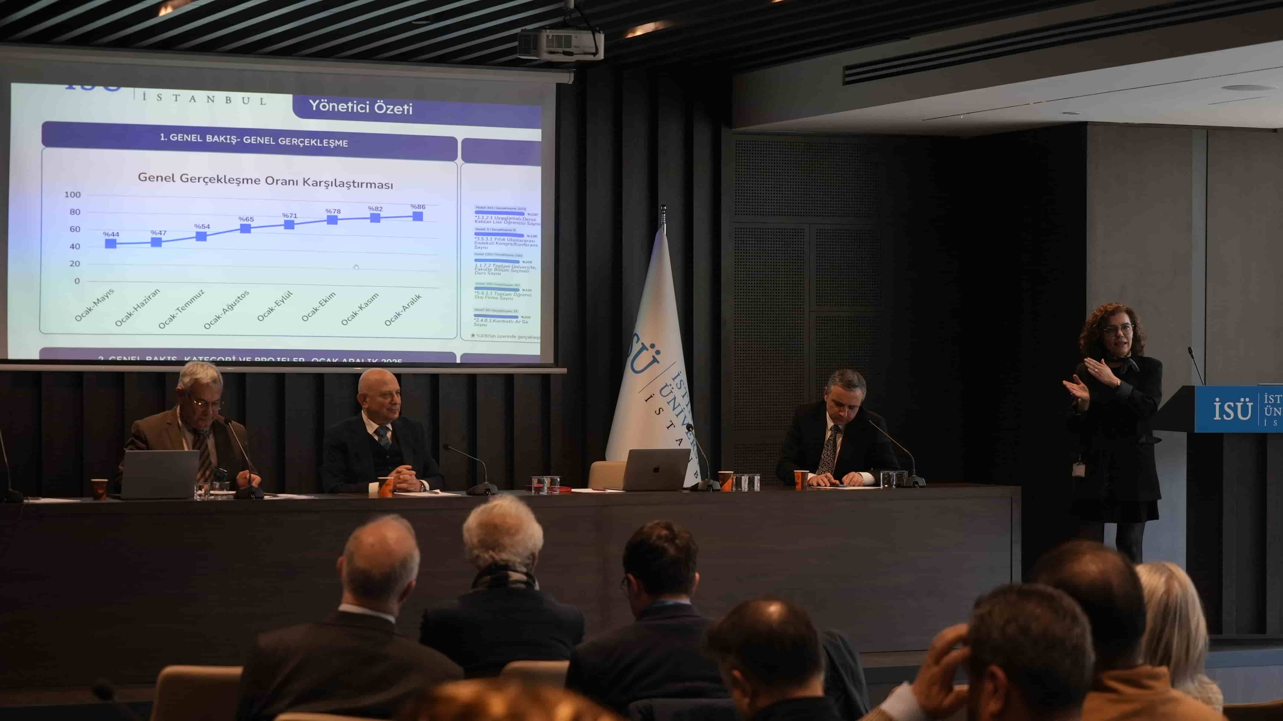 14 Ocak 2026 Çarşamba günü gerçekleştirilen Senato ve Yönetim Kurulu toplantısında, Üçüncü Beş Yıllık Eylem Planı’nın Ocak–Aralık dönemini kapsayan gerçekleşme raporu Stratejik Dönüşüm Rektör Yardımcısı Prof. Dr. Hatice Gülen tarafından sunuldu. Sunumda, plan kapsamında belirlenen stratejik hedefler doğrultusunda kaydedilen ilerleme ele alınarak, hedeflenen çıktılar ile elde edilen sonuçlar karşılaştırıldı ve mevcut durum kapsamlı biçimde değerlendirildi.