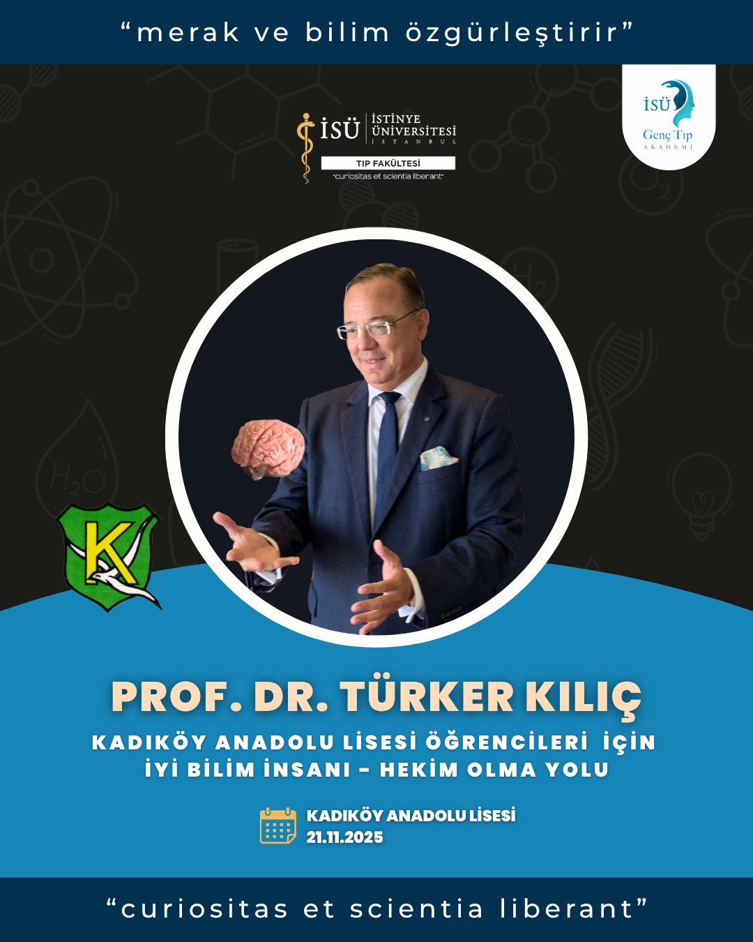 Dekanımız Prof. Dr. Türker Kılıç, 21 Kasım Cuma günü Kadıköy Anadolu Lisesi öğrencileriyle bir araya gelerek, İstinye Üniversitesi Tıp Fakültesi Bilim Sınıfı adaylarıyla buluşacaktır.