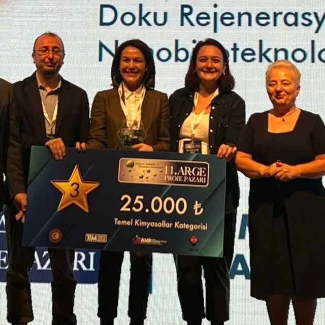 TÜBİTAK tarafından desteklenen, İstanbul Kimyevi Maddeler ve Mamülleri İhracatcıları Birliği (İKMİB)'nin düzenledigi 11. Arge Proje Pazarında "Diaintegra" isimli projesiye "Basarı Hikayesi" Kategorisi ödülü ve "Doku rejenerasyonunu hızlandıran nanobiyoteknolojik ürün geliştirilmesi" başlıklı projesiyle Temel Kimyasallar kategorisinde en iyi 3. proje ödülünü alan, Fakültemiz Tıbbi Biyokimya Anabilim Dalı öğretim üyesi, Dr. Öğr. Üyesi Murat Ekremoğlu hocamızı kutluyor, başarılarının devamını diliyoruz...