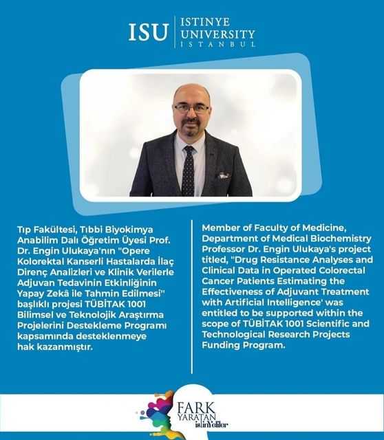 Fakültemiz Tıbbi Biyokimya Anabilim Dalı Öğretim üyesi Prof.Dr. Engin Ulukaya'nın ''Opere Kolerektal Kanserli Hastalarda Direnç Analizleri ve Klinik Verilerle Adjuvan Tedavinin Etkinliğinin Yapay Zeka ile Tahmin Edilmesi'' başlıklı projesi Tubitak 1001 Bilimsel ve Teknolojik Araştırma Projelerini Destekleme Programı kapsamında desteklenmeye hak kazanmıştır.