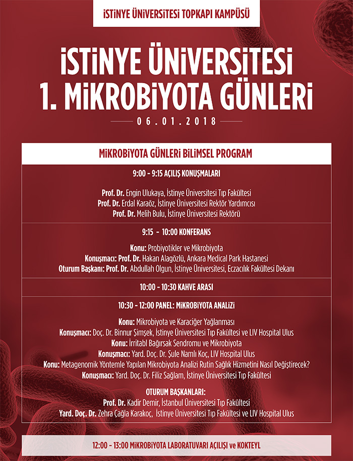 İstinye Üniversitesi Biyokimya Ana Bilim Dalı Başkanı Prof. Dr. Engin Ulukaya ise, insan mikrobiyotasının, tıp için adete yeni bulunmuş bir organ gibi görüldüğünü vurgulayarak, “İnsan mikrobiyotası, vücudumuzda, kendi aralarında birlikte yaşayan farklı mikroorganizmalar topluluklarıdır. Özellikle bağırsak mikrobiyotası, artık bir organ olarak kabul edilmektedir. Her organ gibi bağırsak mikrobiyotasının da sağlıklı bir yaşam için önemli fonksiyonları var ve düzenli çalışmadığı zaman hastalıklar ortaya çıkıyor. Ve sağlık açısından önemli olan, onların hangi oranlarda bir arada olduğunu bulgulamak ve onların bu birlikteliklerini dengeli tutabilmek ve yönetebilmektir. Bu konuda, geniş katılımlı bir sempozyuma ev sahipliği yapmaktan ve ülkemizin ilk mikrobiyota laboratuvarını hizmete sokmaktan, ben ve ekip arkadaşlarımız, büyük bir mutluluk duyuyoruz.” dedi.