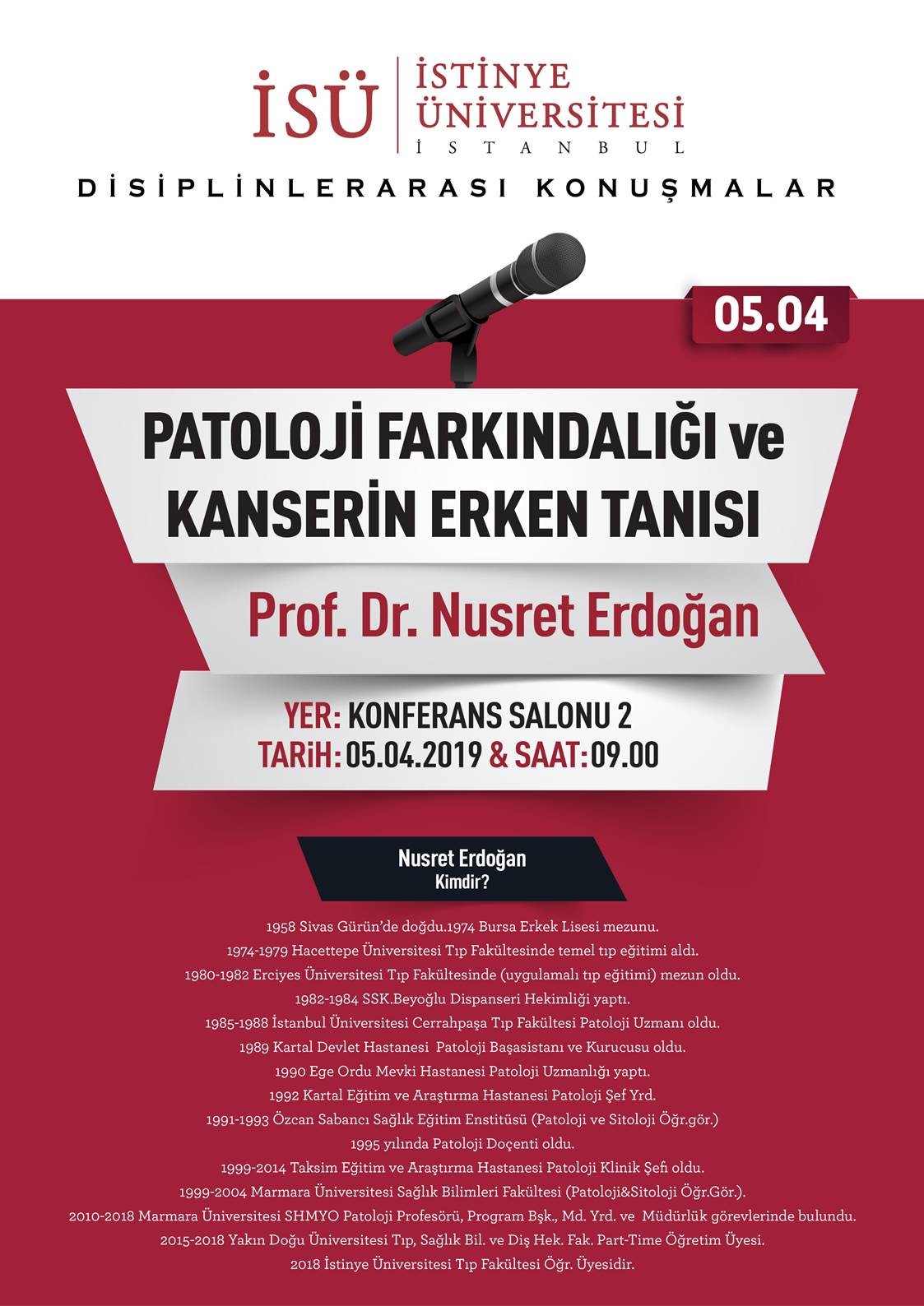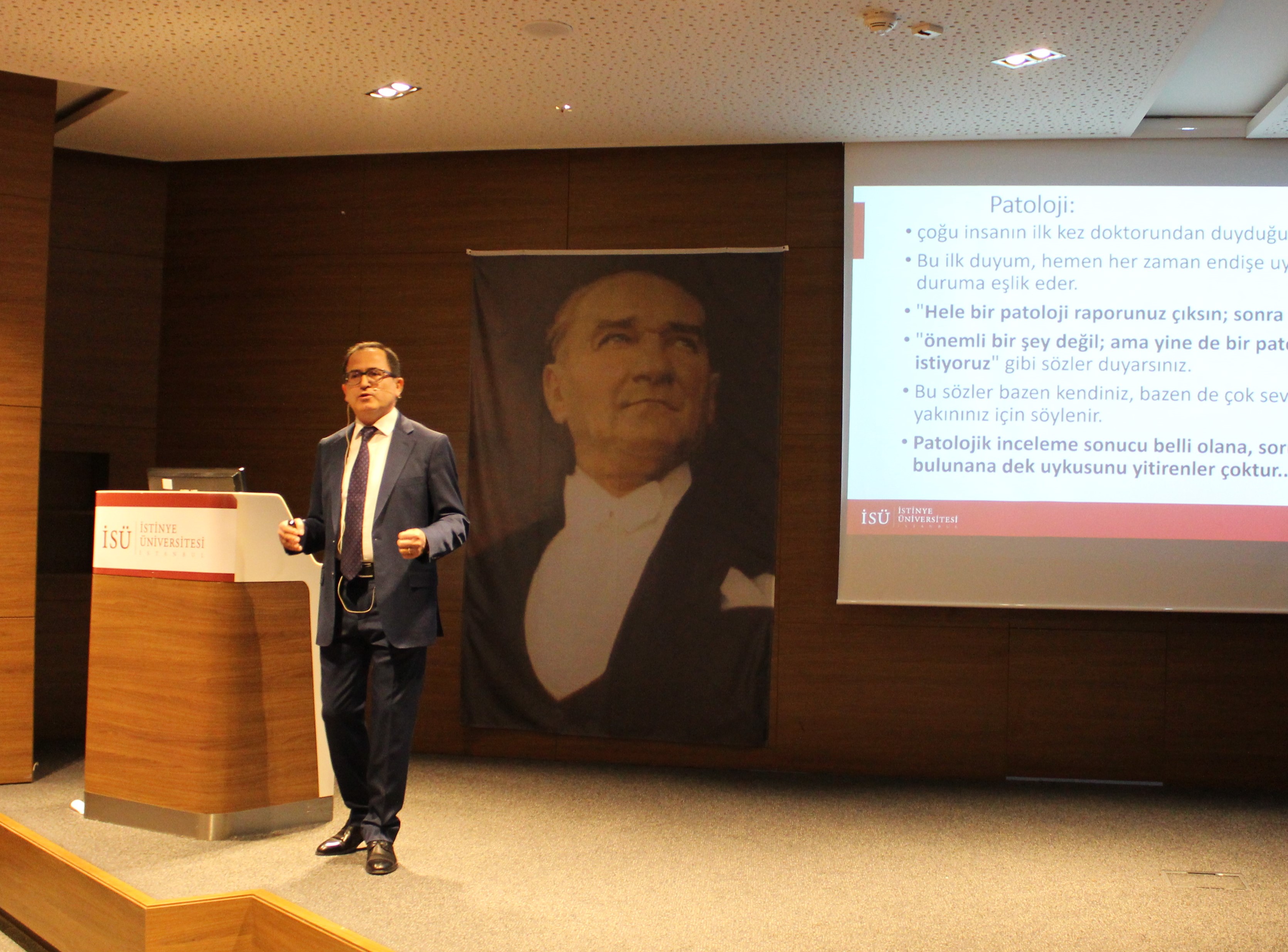 Üniversitemizde haftalık olarak gerçekleştirilen ''Disiplinler Arası Konuşmalar'' etklinlliği kapsamında, bu hafta üniversitemizin değerli öğretim üyesi Prof. Dr. Nusret Erdoğan 'Patoloji Farkındalığı ve Kanserin Erken Tanısı' konulu konuşmasında engin bilgilerini dinleyicelere aktarmıştır.
