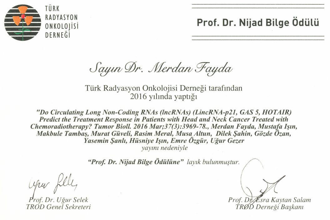 Türk Radyasyon Onkolojisi Derneği tarafından 22. Ulusal Kanser Kongresi kapsamında verilen Prof.Dr. Nijad Bilge ödülünü almaya İstinye Üniversitesi Radyasyon Onkolojisi Anabilim Dalı’ndan Doç. Dr. Merdan Fayda "Do circulating long non-coding RNAs (lncRNAs) (LincRNA-p21, GAS 5, HOTAIR) predict the treatment response in patients with head and neck cancer treated with chemoradiotherapy” isimli çalışması ile layık görülmüştür.