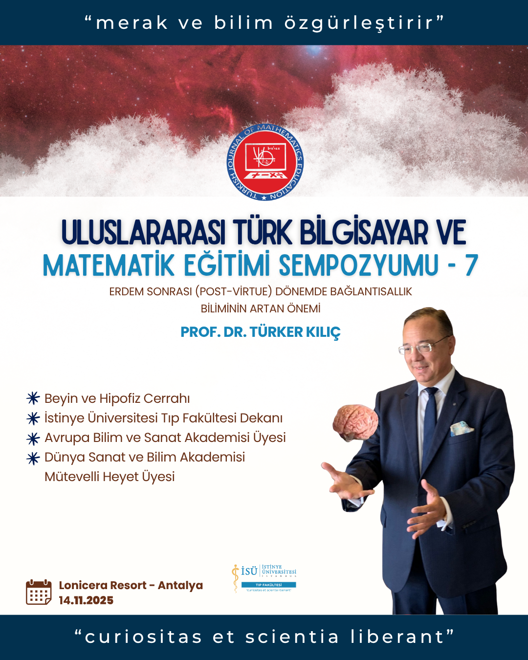 14–16 Kasım 2025 tarihlerinde Antalya’da düzenlenen Uluslararası Türk Bilgisayar ve Matematik Eğitimi Sempozyumu – 7 kapsamında, bugün İstinye Üniversitesi Tıp Fakültesi Dekanı Prof. Dr. Türker Kılıç konuşmacı olarak yer alacaktır.